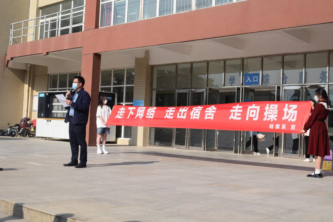在活动启动式上,检察系副主任郭荣军致辞,提出四点要求,鼓励我系广大师生在疫情封校期间积极参与系部和学院相关部门组织的各项体育活动,一要树立“健康第一”观念,注重增强体质;二要“走下网络”,让生活更加多彩;三要“走出宿舍”,让青春更为张扬;四要“走向操场”,让运动带来快乐。参加活动的各位老师和学生庄重地在条幅上签字,以表示对“三走”系列活动的积极响应。