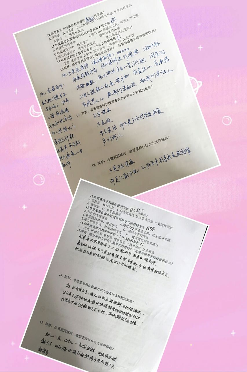 10月16日-17日,检察系通过问卷调查的形式,向每个教学班发放调查问卷,设置了“当课堂纪律不好,有学生在睡觉或玩手机,你希望上课的老师怎么办?”、“你最希望老师在哪方面给予你指导和帮助?”、“你希望老师在授课方式上有什么特别的新意?”等问题。问卷调查的结果统计后及时反馈给了一线教师,希望加强老师对学生的认识,改进自己的教学,达到了“教学相长”的目的。
